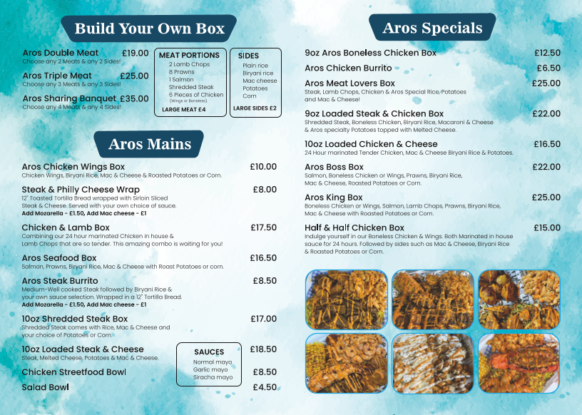 The menu at Aros Kitchen is a treasure trove of flavors. Diners rave about the seafood box and lamb chops, both packed with rich tastes and expertly prepared. The "boss box" stands out for its generous portions, making it a popular choice for those seeking hearty meals at great value.